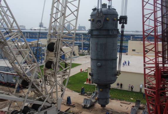 因反應(yīng)器(R-110/120)業(yè)主委托中國外運北京祥龍物流有限公司從營口港陸地運到施工現(xiàn)場,待吊裝完進場的第一臺R-110后,運輸車返回,再運輸?shù)诙_進場。項目部對反應(yīng)器的吊裝高度重視,建立了吊裝領(lǐng)導(dǎo)小組和吊裝工作小組,并從專項吊裝方案的報批、落實,現(xiàn)場吊車吊裝站位基礎(chǔ)的處理、吊裝人員的配備、進行了詳細的技術(shù)和安全交底入手,做了認真、細致和充分的工作準(zhǔn)備,吊裝時采用1000噸主吊、750噸溜尾。整個吊裝:第一臺反應(yīng)器R-110從吊裝索具的懸掛到起吊就位僅用了3小時48分鐘;第二臺反應(yīng)器R-120從吊裝索具的懸掛到起吊就位僅用了2小時48分鐘。