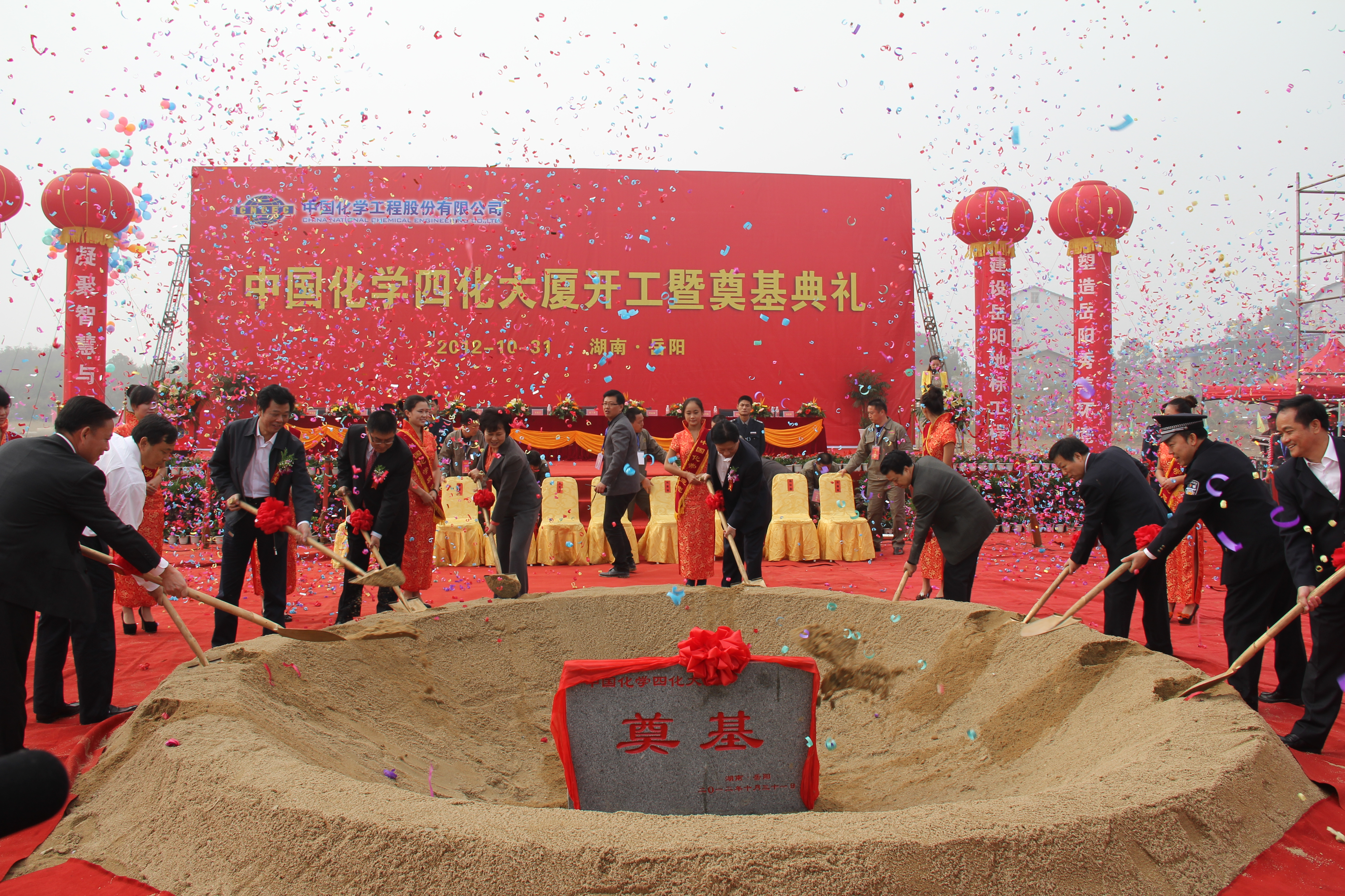中國化學工程集團公司黨委書記、總經理、中國化學工程股份有限公司黨委書記、董事長金克寧出席儀式。岳陽市委書記黃蘭香宣布“中國化學四化大廈開工”。岳陽市委副書記、市長盛榮華,中國化學工程股份有限公司黨委常委、副總經理劉家強,岳陽市經濟技術開發區工委書記胡知榮,公司黨委書記、董事長劉德輝等先后在儀式上致辭。岳陽市委常委、市委秘書長樊進軍,岳陽市委常委、副市長陳四海,岳陽市政府副廳級干部、市公安局局長丁陽云共同出席儀式,并為四化大廈鏟土奠基。開工奠基儀式由岳陽市經濟技術開發區工委副書記、管委會主任劉美樹主持。
