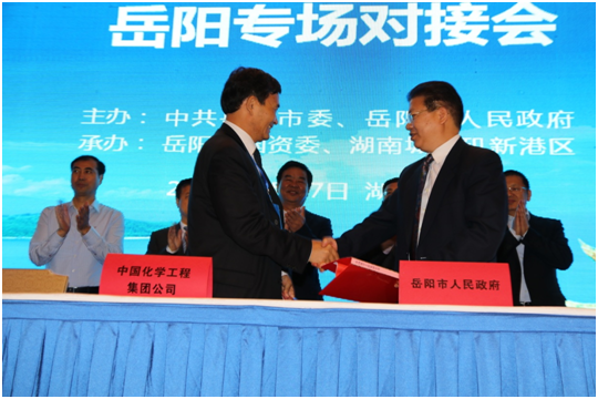 余津勃代表中國化學(xué)工程集團公司,作為第一個央企代表與岳陽市委常委、市政府常務(wù)副市長唐道明簽訂岳陽市人民政府—中國化學(xué)工程集團公司戰(zhàn)略合作框架協(xié)議。協(xié)議內(nèi)容為:岳陽市人民政府支持中國化學(xué)集團公司在岳陽市范圍內(nèi)依法合規(guī)開展化學(xué)工程項目建設(shè)、危化管網(wǎng)改造、城市地下管網(wǎng)建設(shè)、化工管道安裝和其他市政、環(huán)保、工業(yè)廢棄場地處理等項目建設(shè),并在項目前期調(diào)研、項目實施提供支持并營造好的環(huán)境,協(xié)調(diào)在岳項目地履行合同辦理所涉及各項行政審批義務(wù)。中國化學(xué)集團公司協(xié)調(diào)所屬工程公司、基金公司、財務(wù)公司在岳陽市區(qū)域內(nèi)完成項目投資和投融資支持。2016年首批啟動“四化建商業(yè)綜合體建設(shè)工程”等項目。