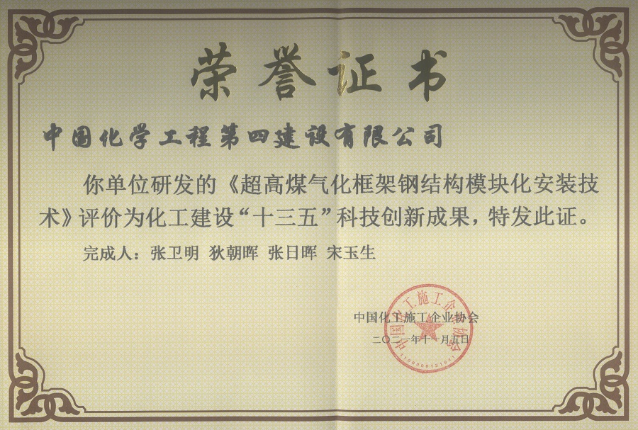 7月25日,從化工協會十屆三次會員代表大會暨科技創新大會傳來喜訊,公司榮獲兩項化工建設“十三五”科技創新成果獎,分別為華南公司完成的高大煙囪豎井架移置模板內翻外提法施工技術和華東公司完成的超高煤氣化框架鋼結構模塊化安裝技術。