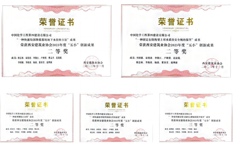 此次“五小”創新活動由西安建筑業協會組織評選,共有來自31家企業的141項創新成果團隊代表參加競賽活動。歷經6個月競賽,并經評審委員會審定,由華東公司發明的五項“五小”成果分別獲獎,其中《一種快速局部降低基坑地下水位的方法》《一種固定在結構梁上用來系掛安全繩的裝置》《一種新型鋼板止水帶》《一種快速檢查線管堵塞位置的裝置》榮獲二等獎,《一種變形縫處剪力墻的支撐加固頂升裝置》榮獲三等獎。