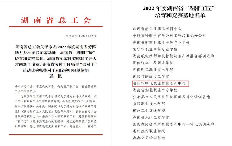 近日,公司岳陽市中化職業技能培訓中心獲湖南省總工會命名2022年度湖南省“湖湘工匠”培育和競賽基地。