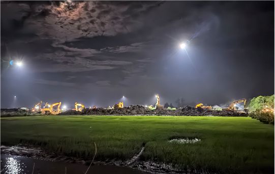 因第三道防線地處岳陽市君山區良心堡鎮一個小村落,基礎設施極不完善,施工面臨村內稻田、水塘、溝渠縱橫,高壓線、照明線架設高度不夠,搶建期間社會車輛、搶險車輛密集通行,土方石方須遠距離運輸等現實困難,公司不等不靠,多方協調、創新方法,有效克服了大型機械進場難、場內交通組織難、土方石方調配難、安全管理執行難等難以想象的困難,比預期提前8個小時實現堤壩合龍。