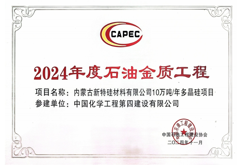 近日,由西部公司參建的內蒙古新特硅材料有限公司10萬噸/年多晶硅項目獲評中國石油工程建設協會“2024年度石油金質工程獎”。