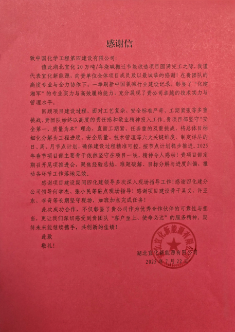 7月22日,中國化學四化建收到湖北宜化新能源有限公司發來的感謝信,信中對公司在湖北宜化20萬噸/年燒堿搬遷節能改造項目建設中的突出表現給予充分肯定和高度贊揚。