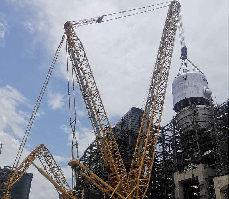 為順利完成該燒炭器的吊裝組對(duì)和確保工期,項(xiàng)目部組織人員加班加點(diǎn),僅一周就做好吊裝前各項(xiàng)施工準(zhǔn)備,為順利吊裝奠定了堅(jiān)實(shí)基礎(chǔ)。此次吊裝采用1250噸履帶吊主吊,經(jīng)過24小時(shí)奮戰(zhàn),成功完成燒炭器的吊裝組對(duì)。