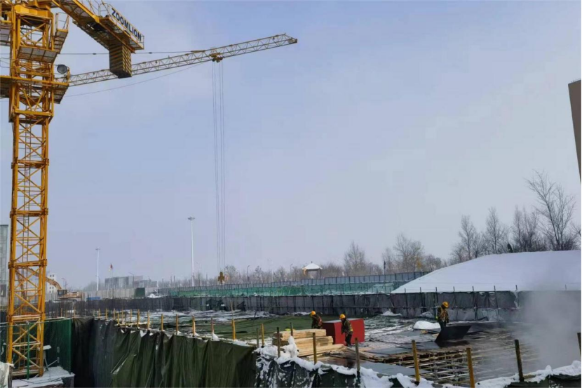 該項(xiàng)目所處新疆烏魯木齊,冬季施工時(shí)溫度已達(dá)零下,且隨時(shí)面臨氣溫驟降的可能,工期十分緊張。為安全、高效、高質(zhì)量完成目標(biāo),項(xiàng)目部提前策劃,精心部署,發(fā)揮黨員示范帶頭作用,經(jīng)過(guò)60余小時(shí)的攻堅(jiān)奮戰(zhàn),分兩次完成了此次筏板澆筑工作。同時(shí),為防止冬季施工凍融現(xiàn)象對(duì)周邊既有結(jié)構(gòu)及基坑內(nèi)部造成不良影響,項(xiàng)目部在筏板四周及中間部位搭設(shè)暖棚及蒸汽暖氣包,澆筑時(shí)嚴(yán)格控制砼入模及成型溫度,及時(shí)覆蓋薄膜,并在砼初凝后覆蓋棉被確保混凝土質(zhì)量。