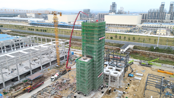 近日,由中國化學四公司華南公司承建的廣東東粵化學科技有限公司20萬噸/年混合廢塑料資源化綜合利用示范性項目順利完成裂解單元(構-3)41.95m層梁板混凝土澆筑封頂。